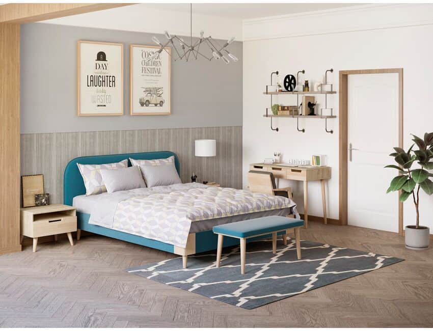Оригинальная кровать в обивке из мебельной ткани.