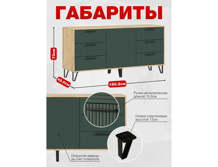 Комод имеет размеры 1502 мм в ширину, 730 мм в высоту и 426 мм в глубину, что обеспечит вам достаточно пространства для хранения различных вещей. Благодаря своей продуманной конструкции, он отлично подойдет как для спальни, так и для гостиной. Универсальный стиль позволит интегрировать его в любой интерьер, от классического до минималистичного.