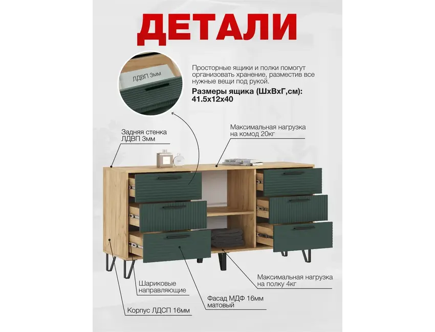 Материалы, использованные в производстве комода, обеспечивают его долговечность и устойчивость к повреждениям, что делает его отличным выбором для активного использования в повседневной жизни. Комод легко сочетать с другим мебельным гарнитуром, а его современный дизайн обеспечит гармоничное вписывание в любую обстановку.