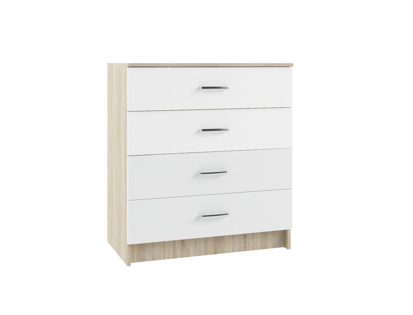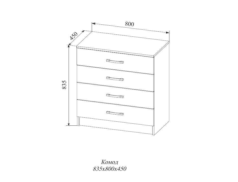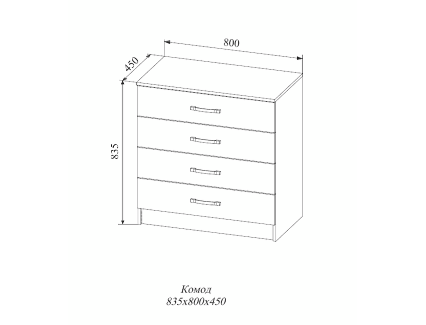 Вместительный комод с четырьмя ящиками одинакового размера. Легкое бесшумное скольжение ящиков обеспечивают качественные выдвижные механизмы.