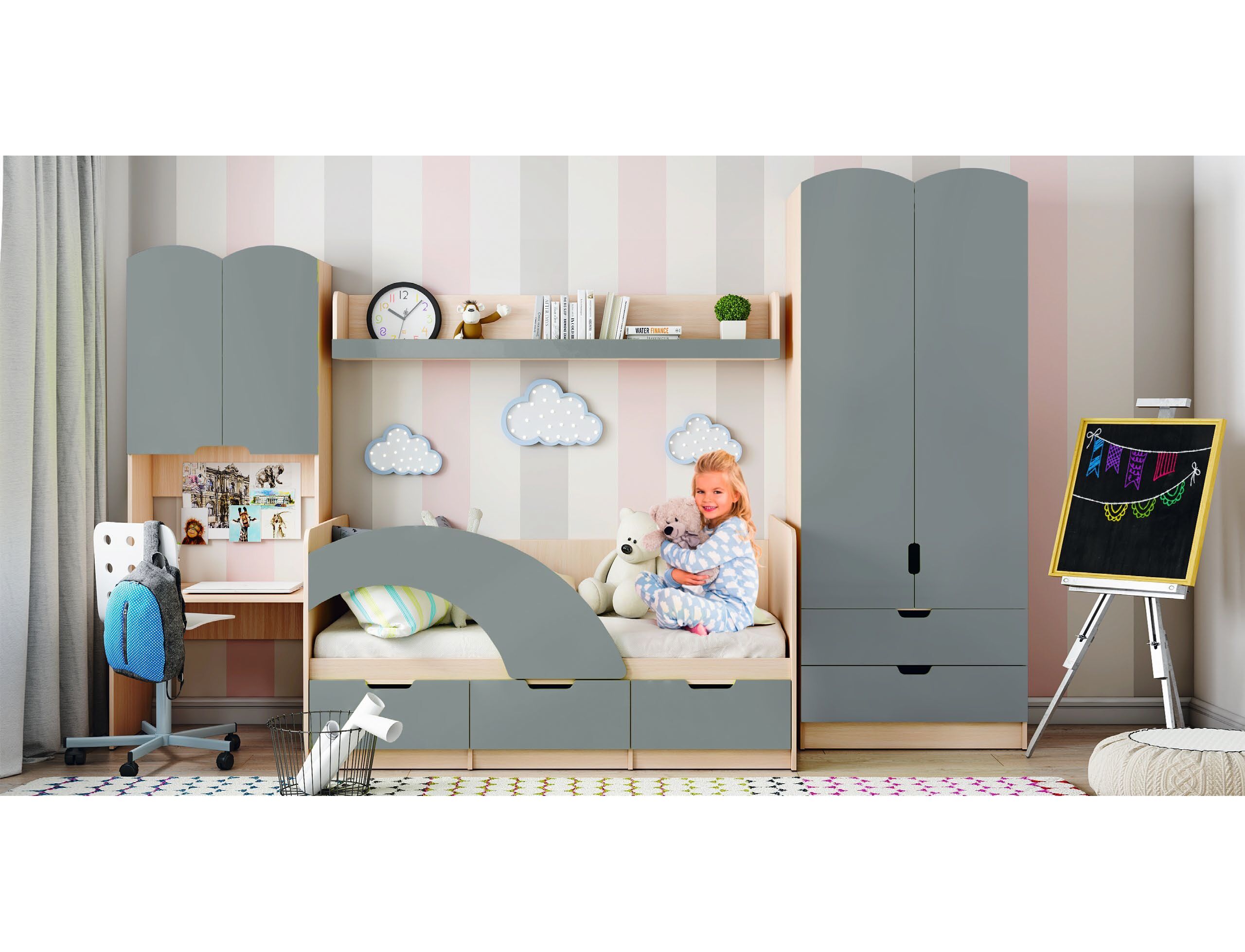 - Комплектация: кровать, полка, шкаф, стол с надстройкой.