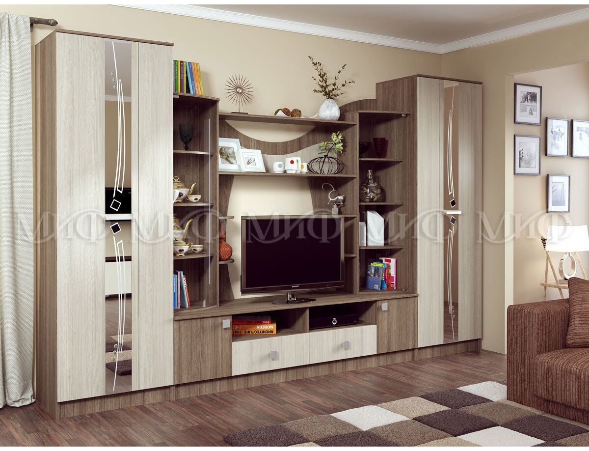Классическая стенка, сочетающая в себе разнородные материалы дерево, стекло и металл. Пеналы со стеклянными дверцами послужат витриной для коллекционной посуды. В большой гостиной займет достойное место.