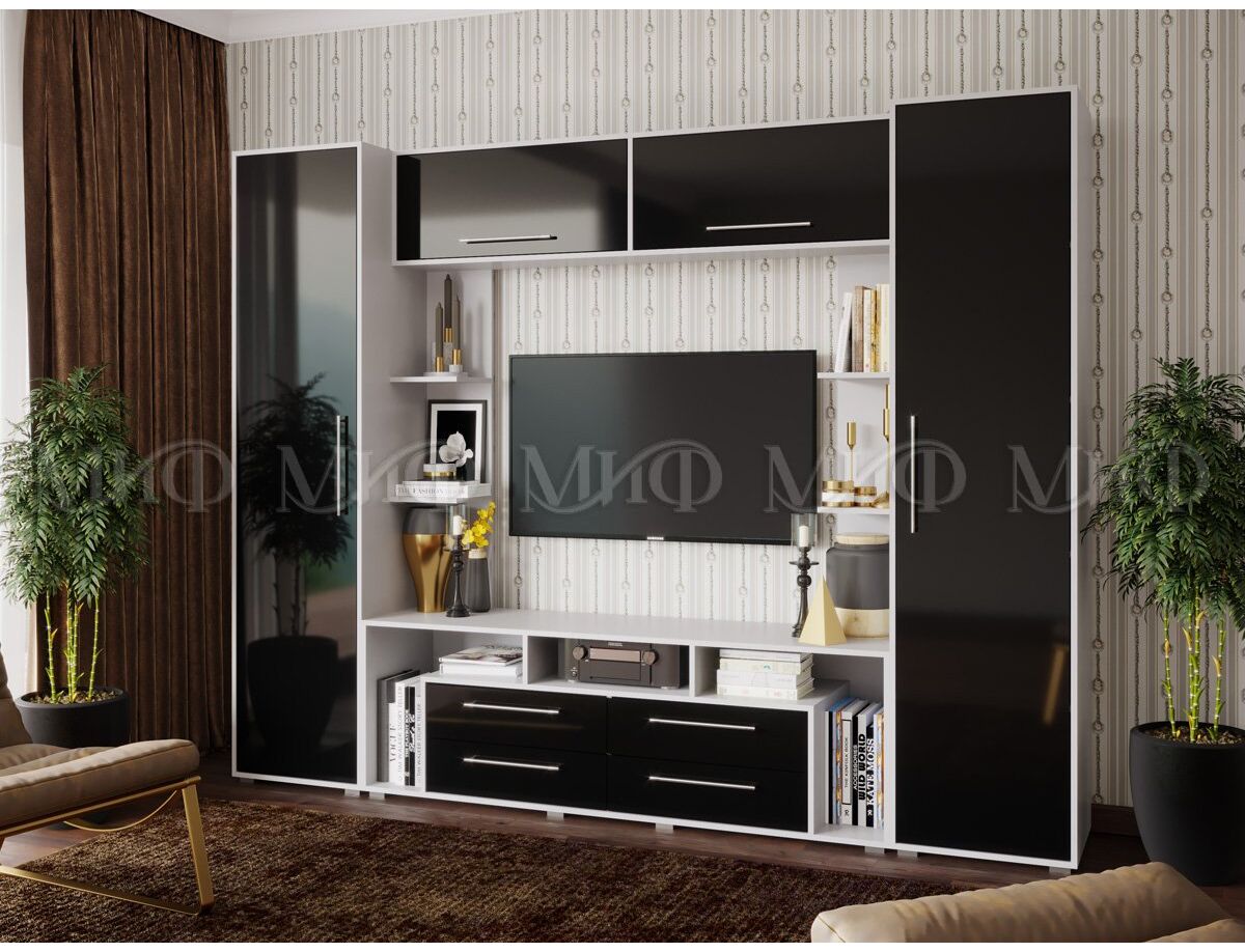 Современная и стильная гостиная черный глянец беспроигрышная визитка вашего дома. Сделает интерьер динамичным и выразительным, создаст атмосферу спокойствия и умиротворения. Это гостиная с открытыми полками для декора.