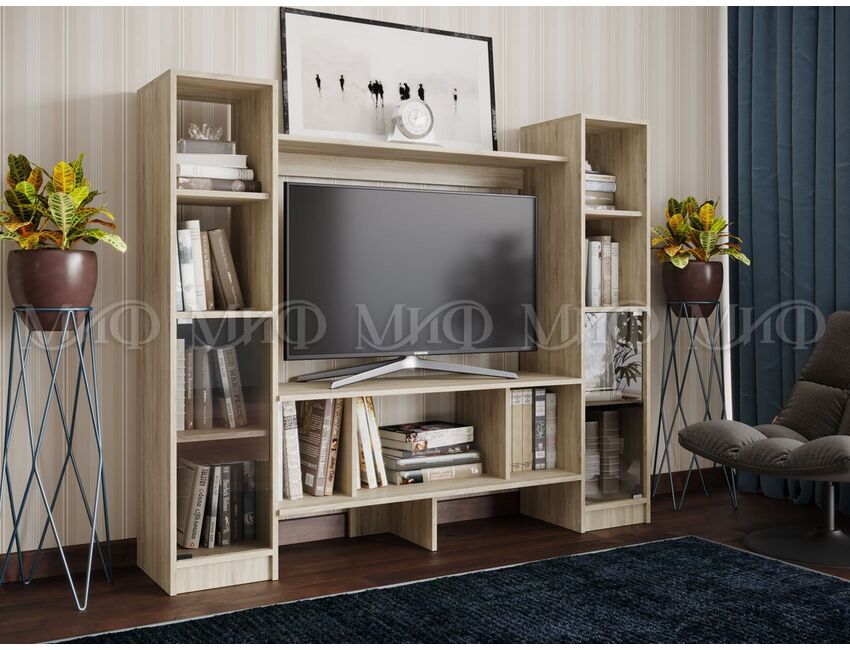 Эта маленькая стенка, скорее, напоминает стеллаж, но в небольшом помещении станет хорошей альтернативой многофункциональному мебельному гарнитуру. Смотрится компактно, аккуратно и в то же время стильно.
