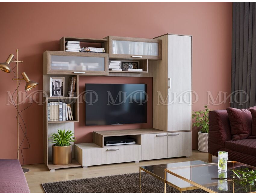Эффектная гостиная в контрастном цветовом исполнении. Открытые секции гармонично сочетаются с закрытыми. Верхняя часть каскадная, что характерно для современной мебели.
