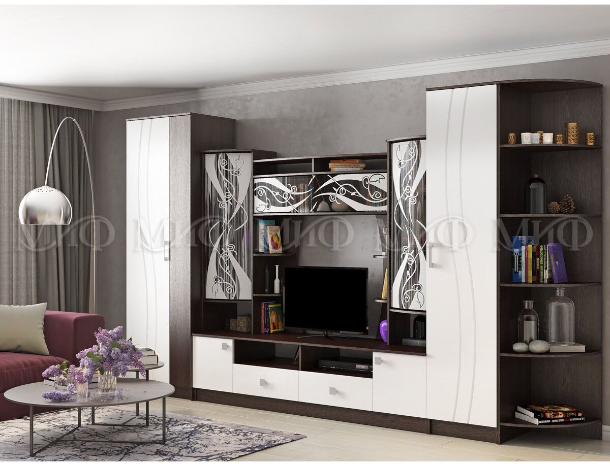 Белая гостиная из мдф. Яркое решение для гостиной комнаты. Стеклянные дверцы верхних фасадов за счет их декорирования матовым рисунком, выглядят стильно и практично. Гостиные со стеклом - хорошая возможность создать уникальный интерьер.