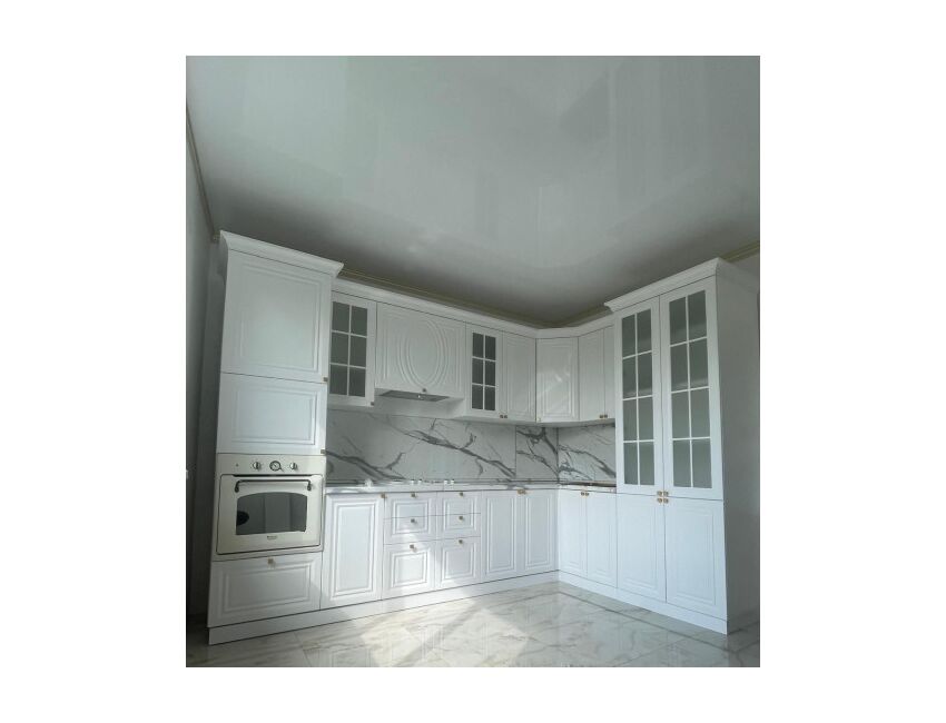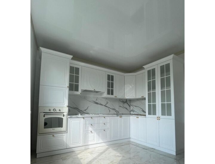 Классическая Кухня Такия угловая 3.20/200см в жемчужно-белом цвете с пеналами по бокам и витринными фасадами. Столешница и стеновая панель идет в комплекте. В кухне есть выдвижные ящики. Петли с доводчиками.