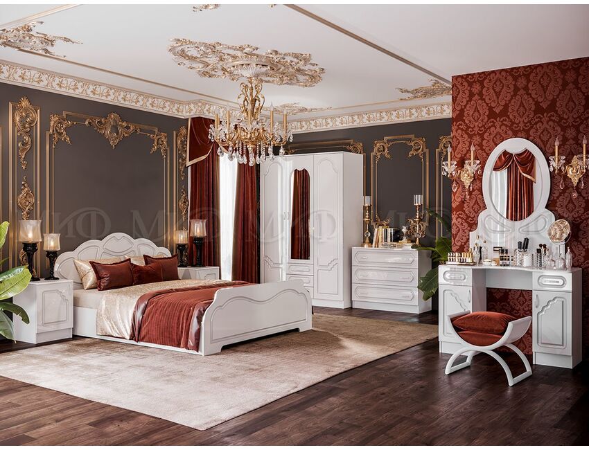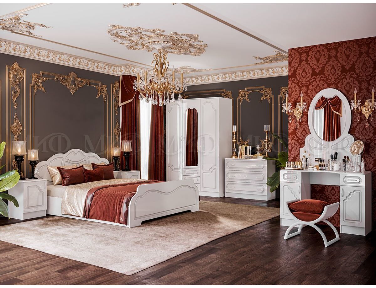 Фасады с простым резным рисунком, кровать с красивым изголовьем. Дизайн спальни направлен на создание спокойной атмосферы для отдыха и сна.