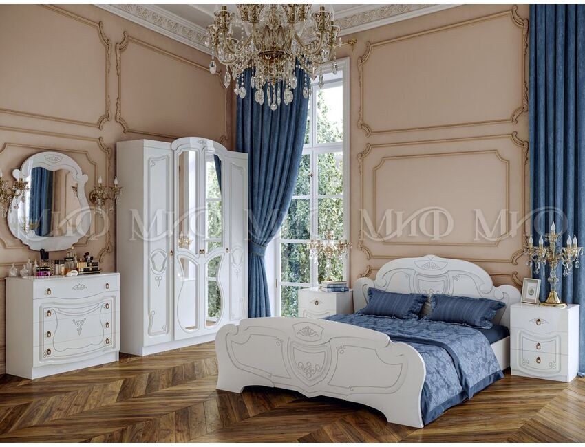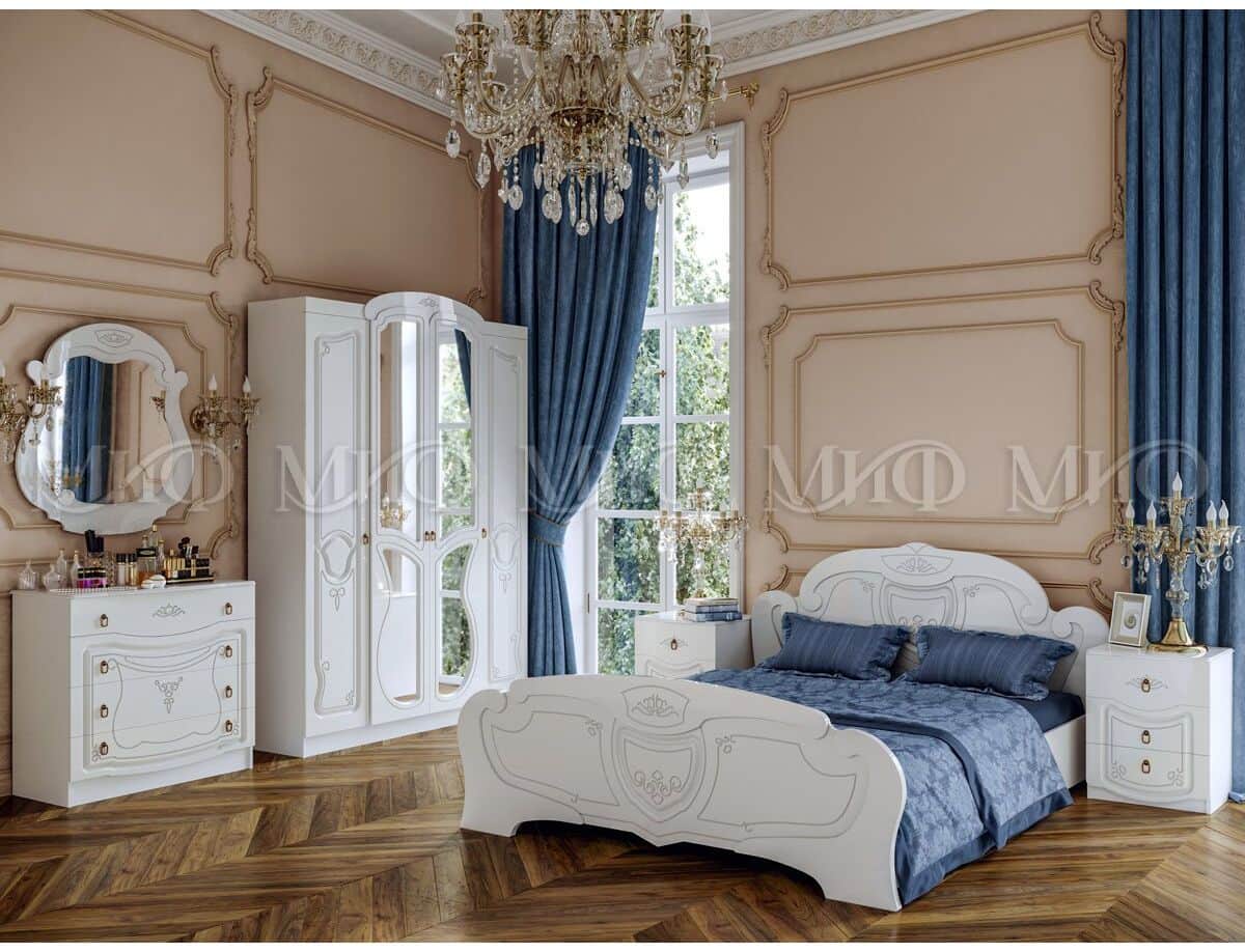 Элегантная спальня Мария украсит любую квартиру. Все предметы этой мебели с белыми фасадами идеально дополняют друг друга. Плавные линии и резные элементы декора придутся по вкусу ценителям уюта и комфорта.
