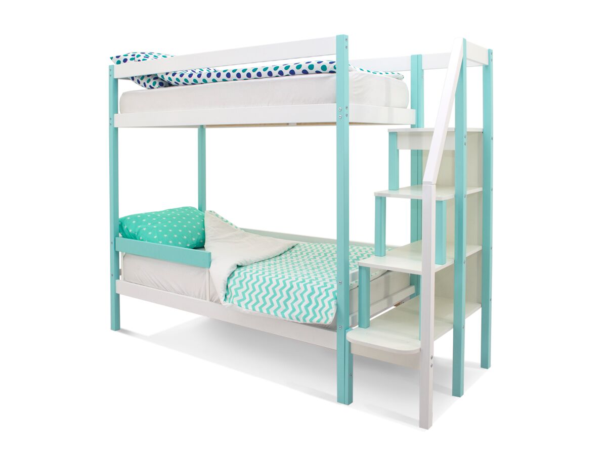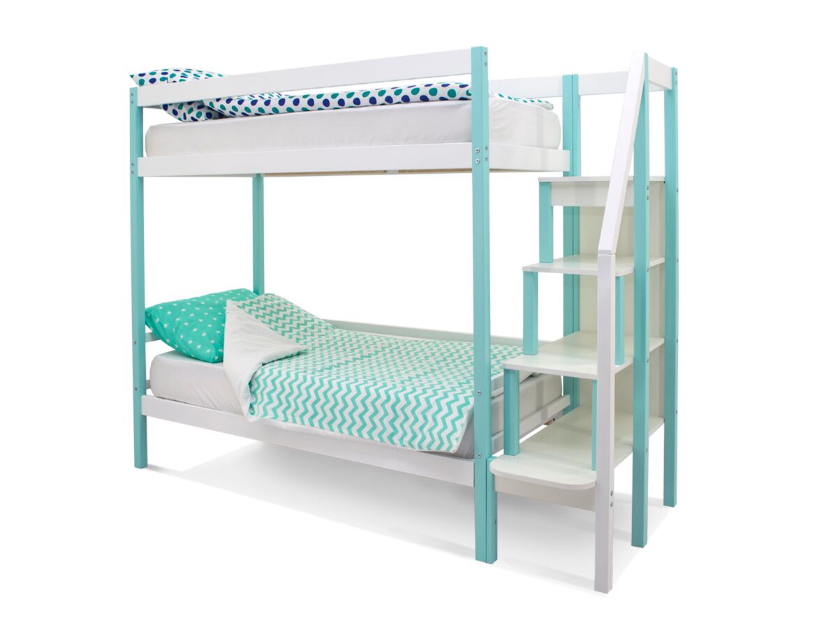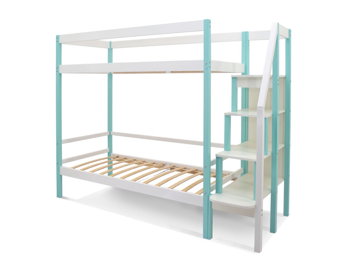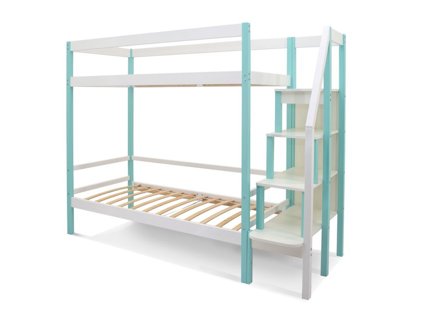 Кровать оборудована практичной лестницей-стеллажом. Полки лестницы можно использовать для игрушек, книг, ночника. Лестницу легко зафиксировать как справа, так и слева от кровати, что очень удобно. На каждом ярусе установлено прочное ортопедическое основание из 12 лат. Спальное место выдерживает нагрузку до 200 кг.