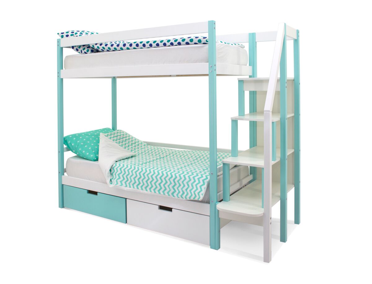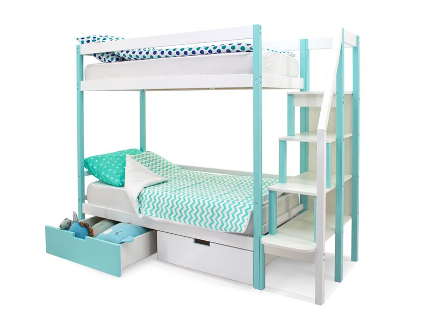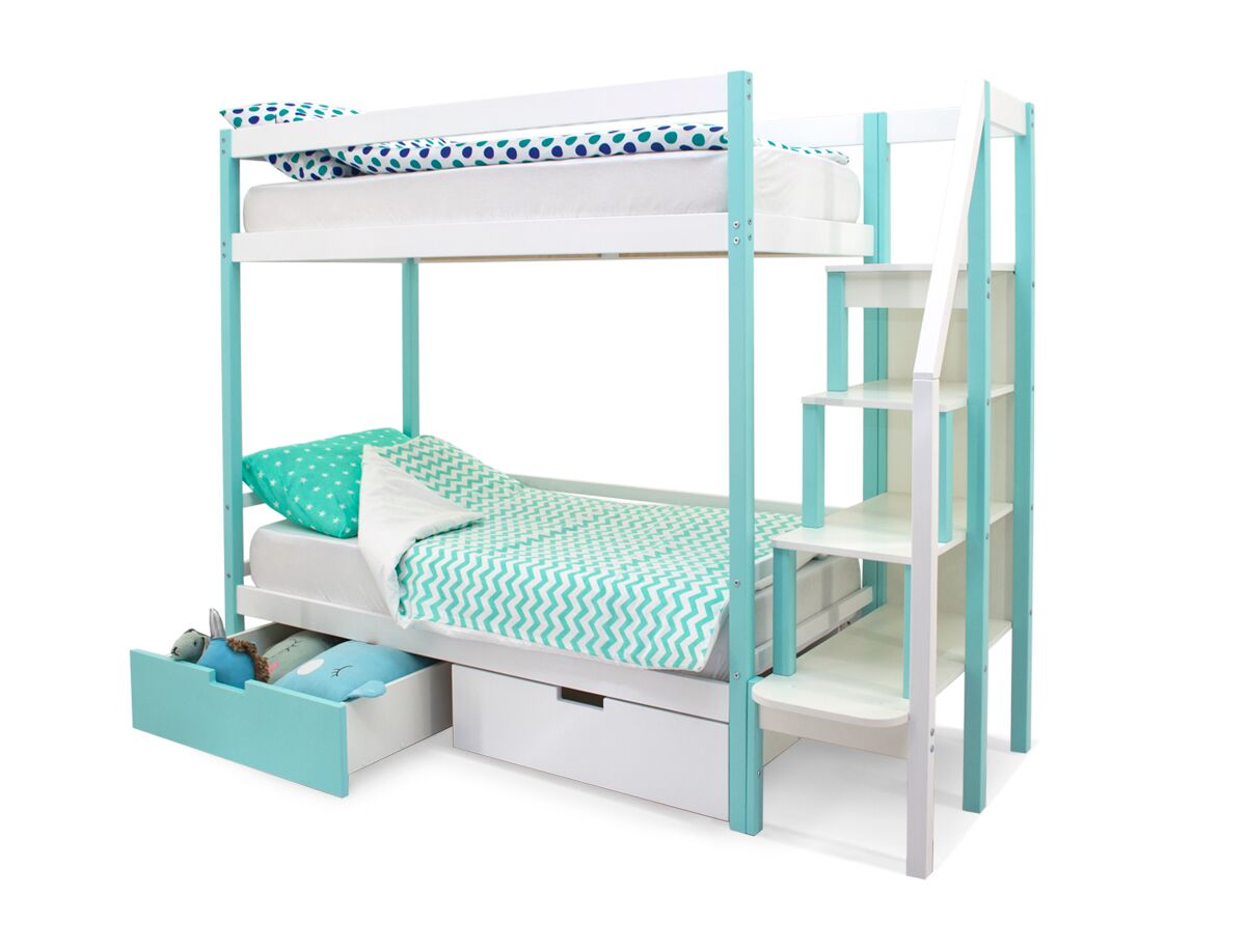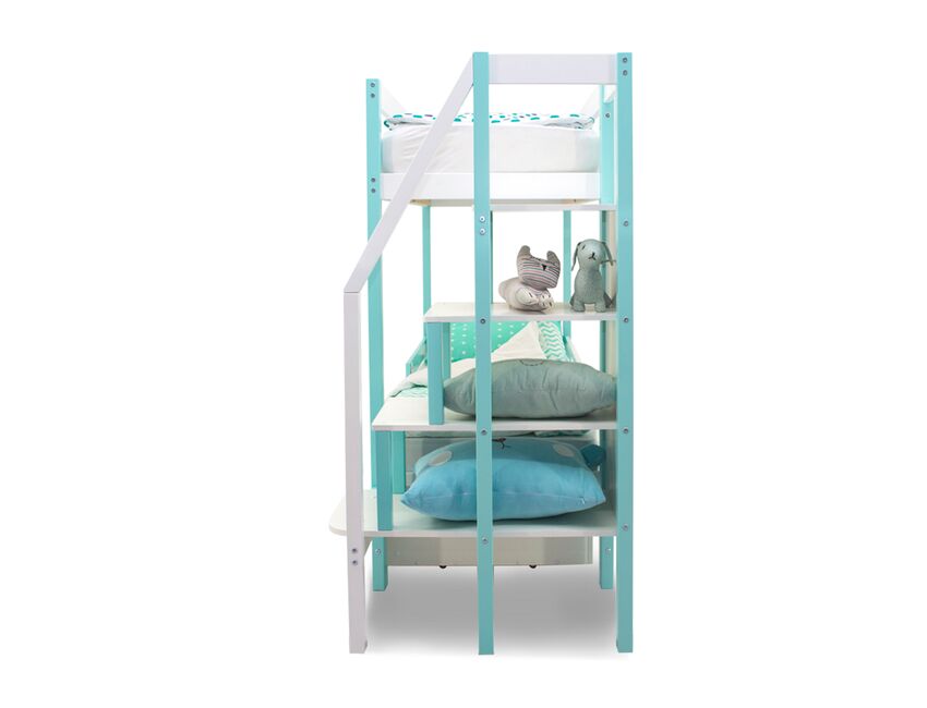 Благодаря своей конструкции, при которой оптимальна высота между ярусами и ширина спальных мест, кровать комфортна и удобна для сна и игр. Лестница и ящики под кроватью – это отличные места для хранения любых вещей.