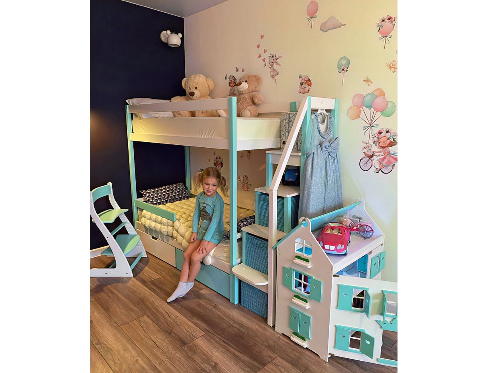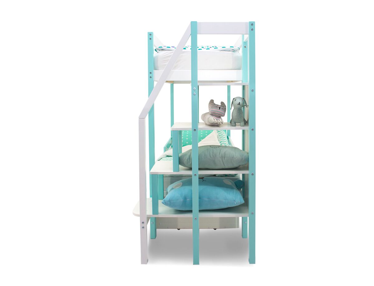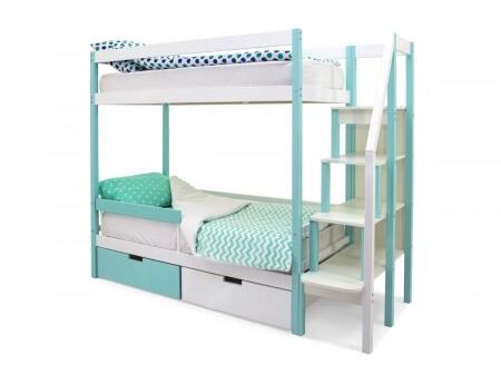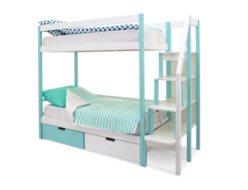 Благодаря своей конструкции, при которой оптимальна высота между ярусами и ширина спальных мест, кровать комфортна и удобна для сна и игр. Лестница и ящики под кроватью – это отличные места для хранения любых вещей.