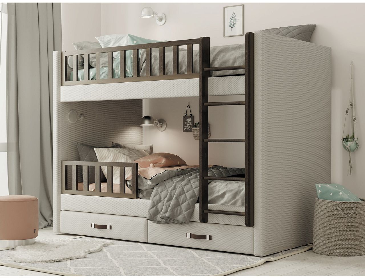 Двухъярусная кровать Sonata — это сочетание мягких и твердых материалов, светлых и темных цветов. Эта модель для детей, которые похожи по своему характеру и при этом совершенно разные, но дополняющие друг друга. А еще это вариант для малышей, которые любят комфорт и технологии: все благодаря встроенной bluetooth-системе. Модель лаконично впишется в разные интерьеры, позволит рационально использовать пространство: спальные места расположены друг над другом, и нет необходимости покупать две отдельные кровати. А ящики легко заменят комод для белья. Стоимость указана во 2-й категории ткани. Стоимость кровати со встроенной стерео-системой - от 87 745р