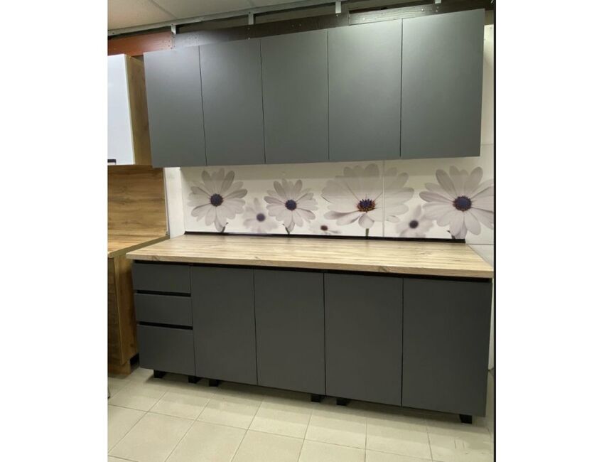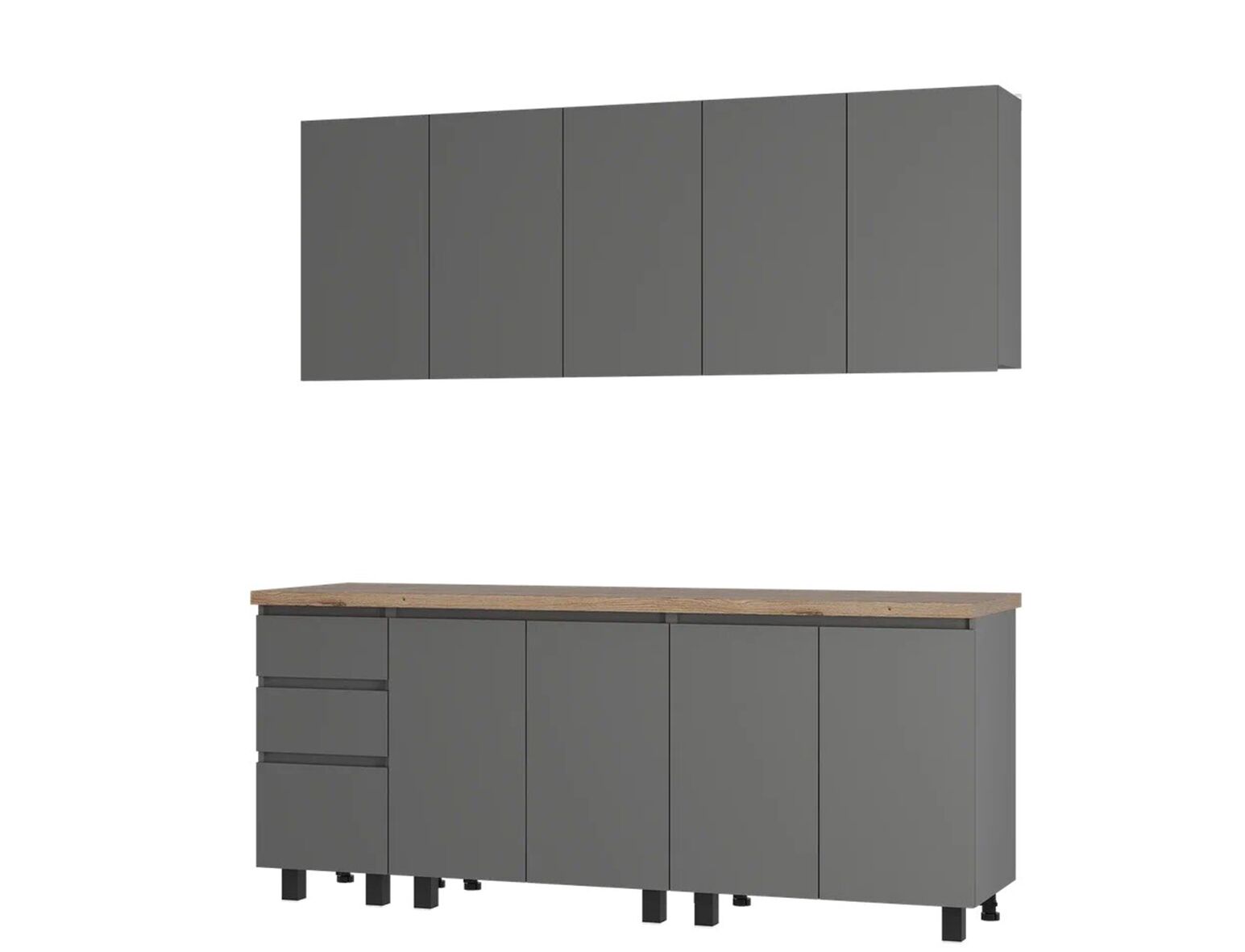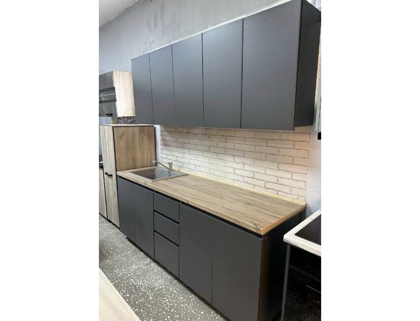Прямая кухня Честер с фасадами из ЛДСП цвета графит. В кухню входят верхние навесные шкафы, стол, мойка и стол с выдвижными ящиками, опоры и столешница.