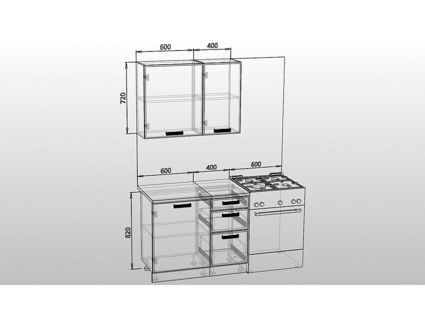 Габаритный размер готового набора модулей с учетом газовой плиты на 60см: 160см.