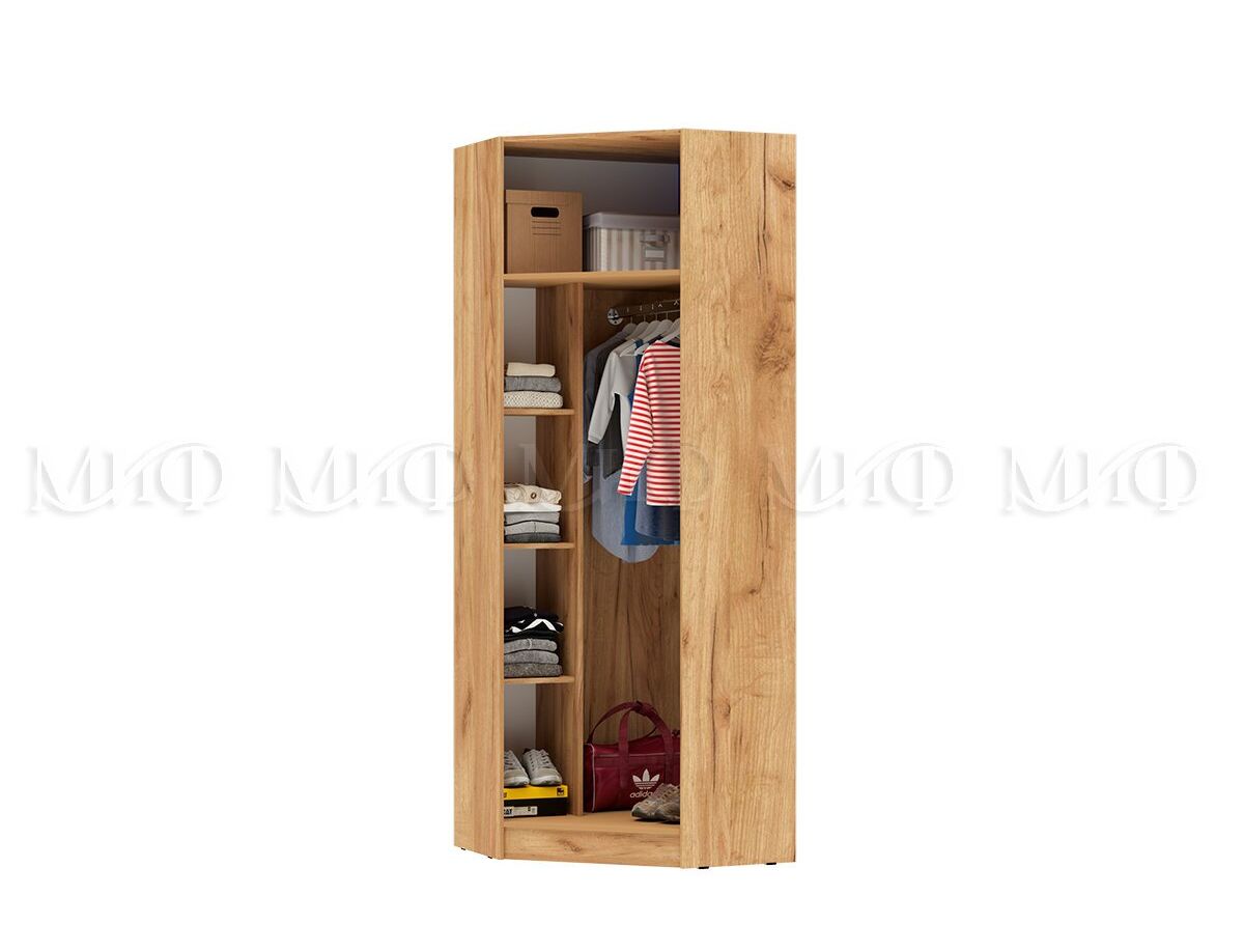 Шкаф угловой для детской комнаты оснащен полками и штангой, имеет компактный размер и глубину боковины всего 40см.