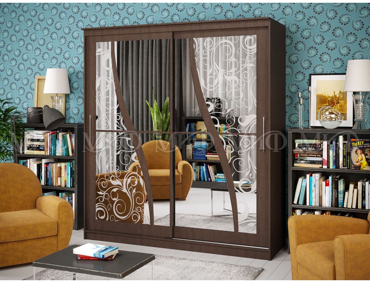 На фото - шкаф-купе с пескоструйным рисунком. Это достойное решение для современного интерьера. Обычный шкаф-купе за счет уникального дизайна приобретает новую эстетику. Большие зеркала декорированы пескоструйным рисунком.