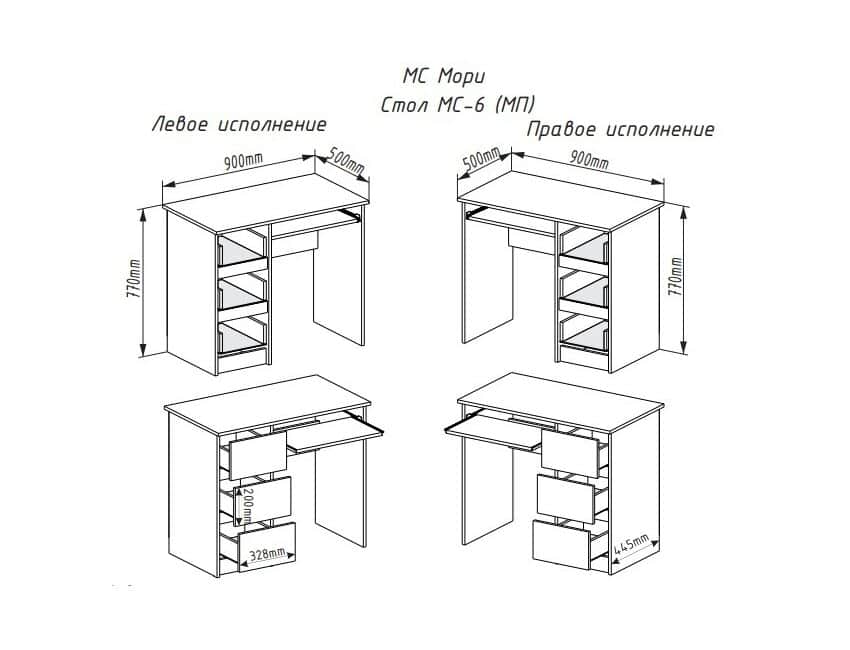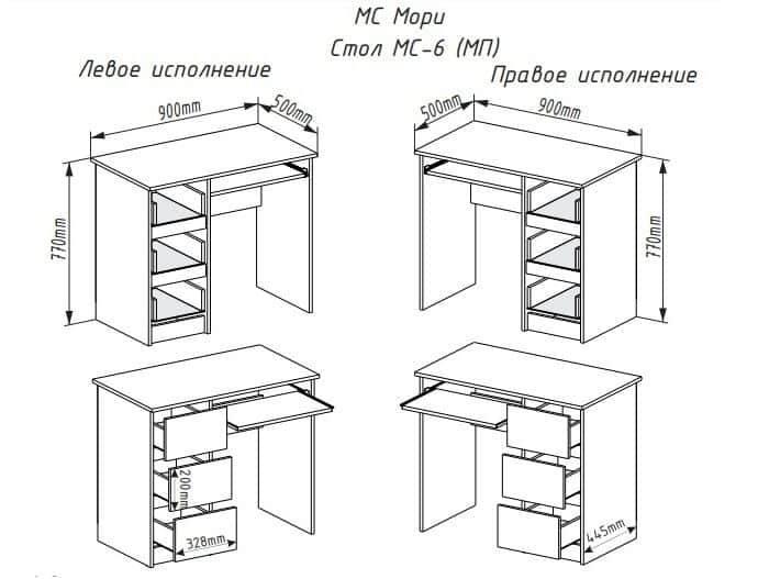 Стол оснащен выдвижной полкой на роликовых направляющих для удобного использования и хранения клавиатуры. Справа или слева может располагаться тумба (зависит от выбора исполнения стола) с выдвижными ящиками. На фасадах ящиков отсутствуют ручки, функцию ручек выполняет сам фасад (его верхняя часть с внутренней стороны прямая под углом 90°). Открывание ящиков производится за счет пространства между планками и фасадами.