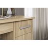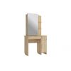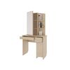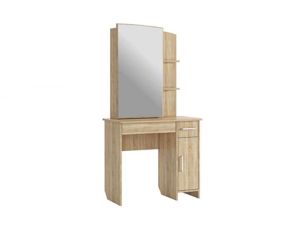 Трюмо Виктория 1 - удобная модель с зеркалом и большим количеством мест хранения - два выдвижных ящика под столешницей и ниша за "глухим" фасадом, а также три открытых полки сверху. За зеркалом расположены еще три полочки, что позволит расставить большое количество косметики и парфюмерии. Трюмо изготовлено из ЛДСП в тонировке Дуб Сонома. Распашная дверца закрывается плавно, без лишнего шума. У столешницы предусмотрены скругленные углы.