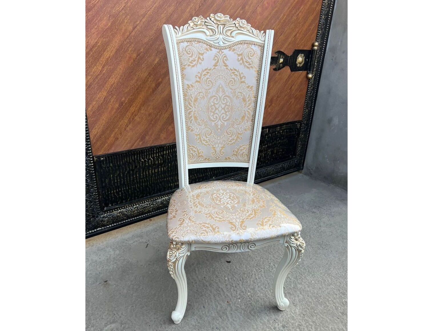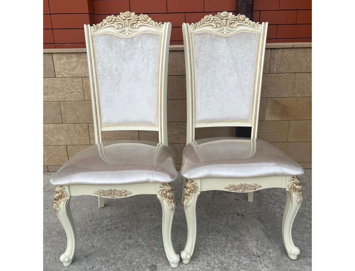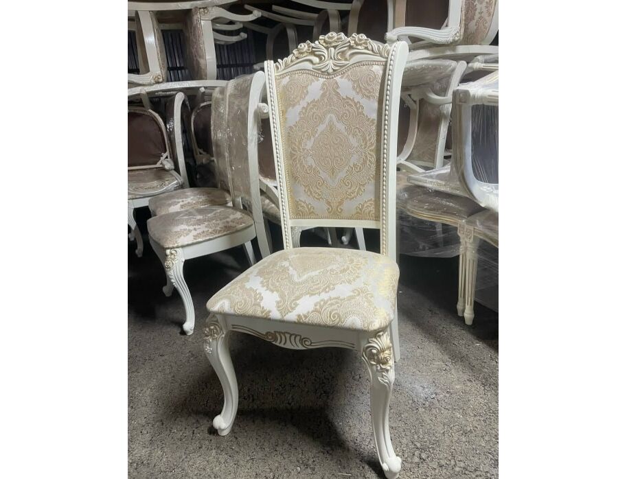 Стулья Роза Декор в стиле барокко имеют плоскую сидушку, две передние ножки выполнены из ПУ, задняя спинка и ножки - из массива бука. Цвет ткани вы можете выбрать на заказ. Цвет каркаса: слоновая кость, орех, белый.